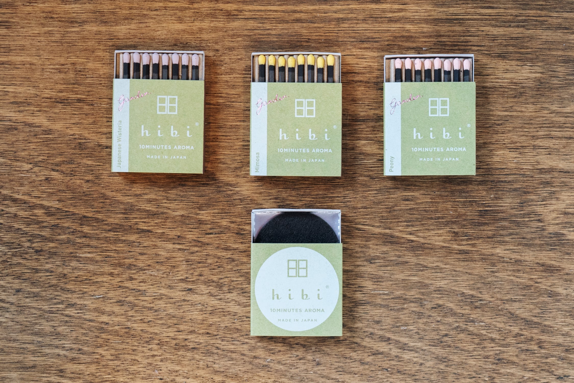 藤・ミモザ・ピオニーのレギュラーボックス(8本入り)と専用のお香マットがセットになっています。