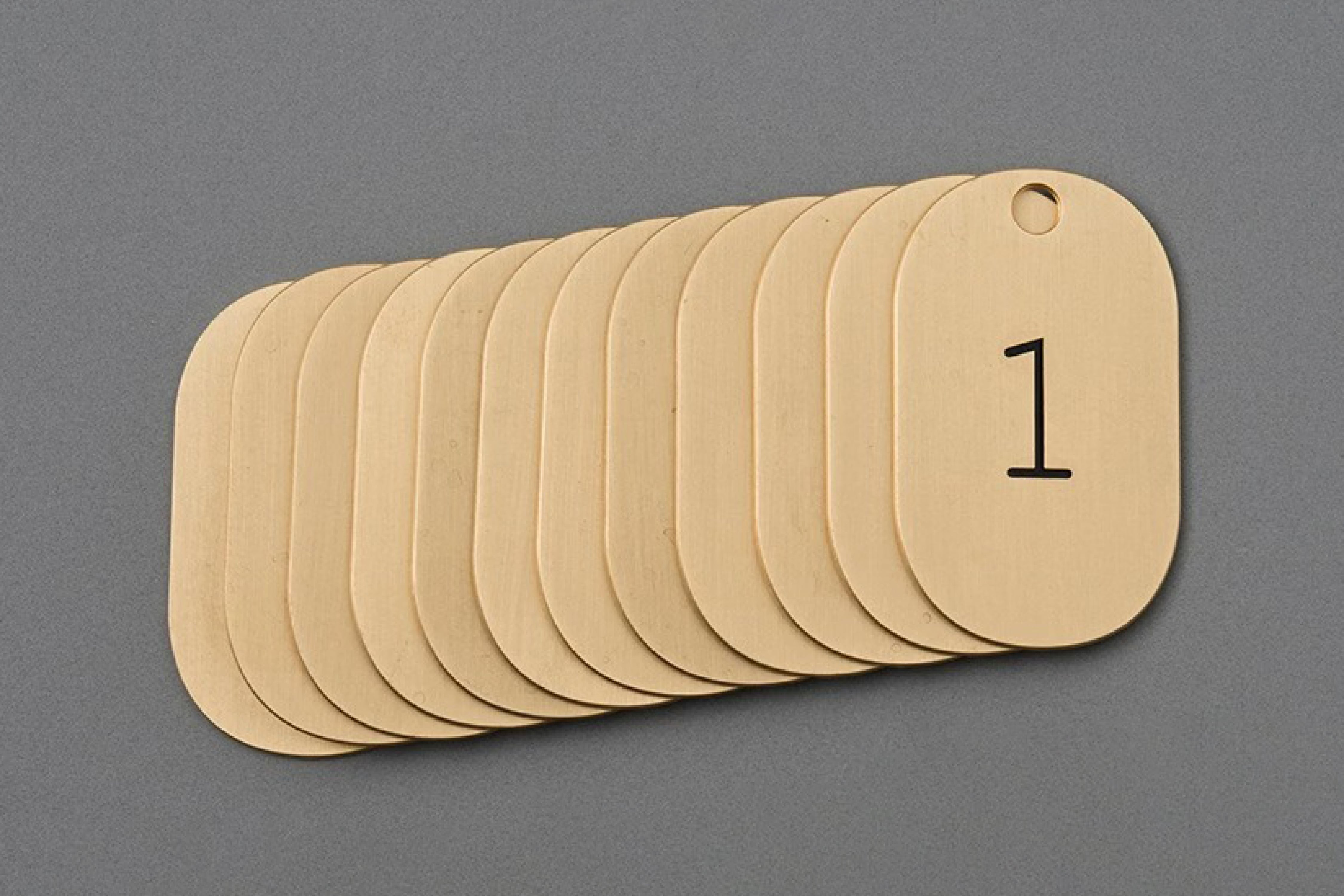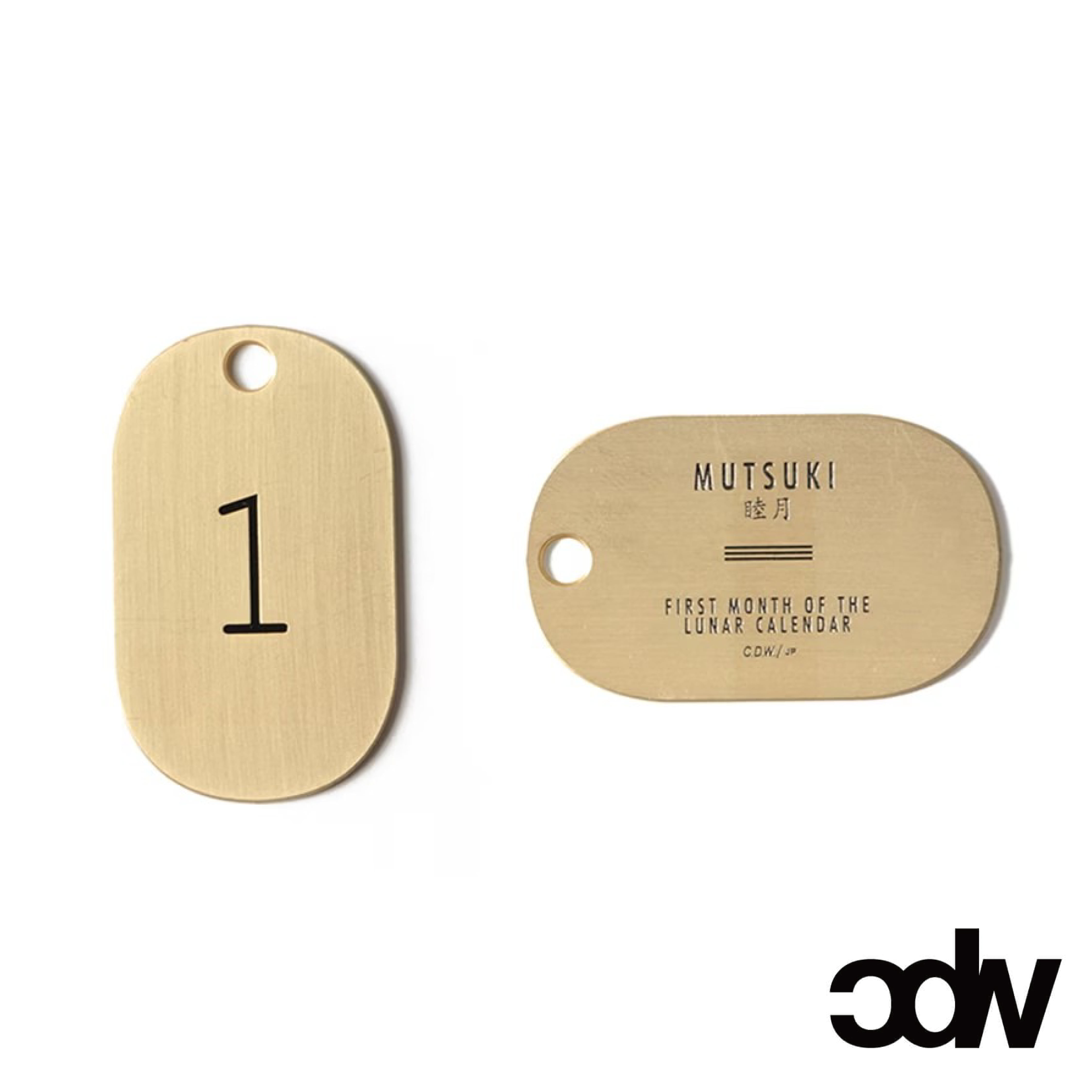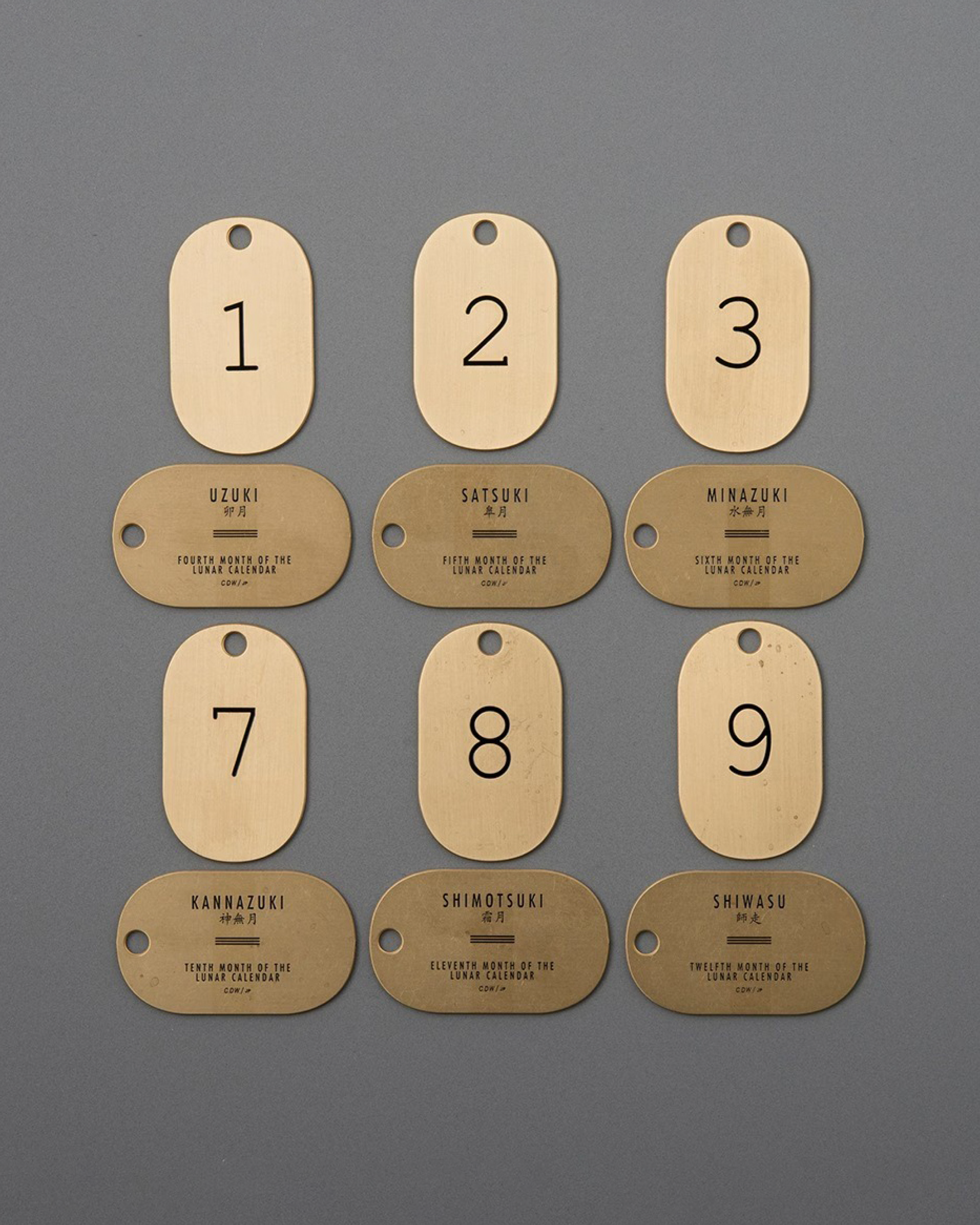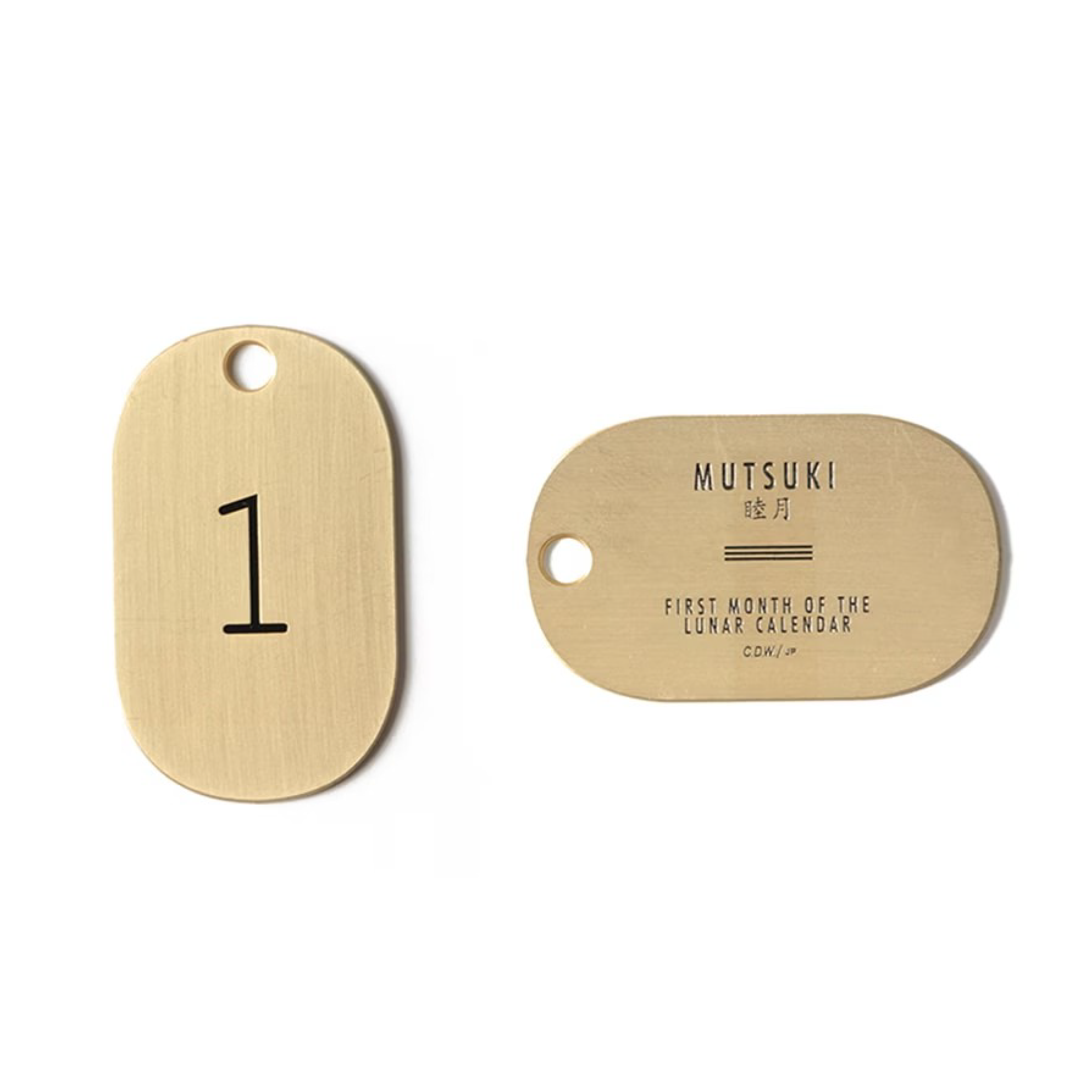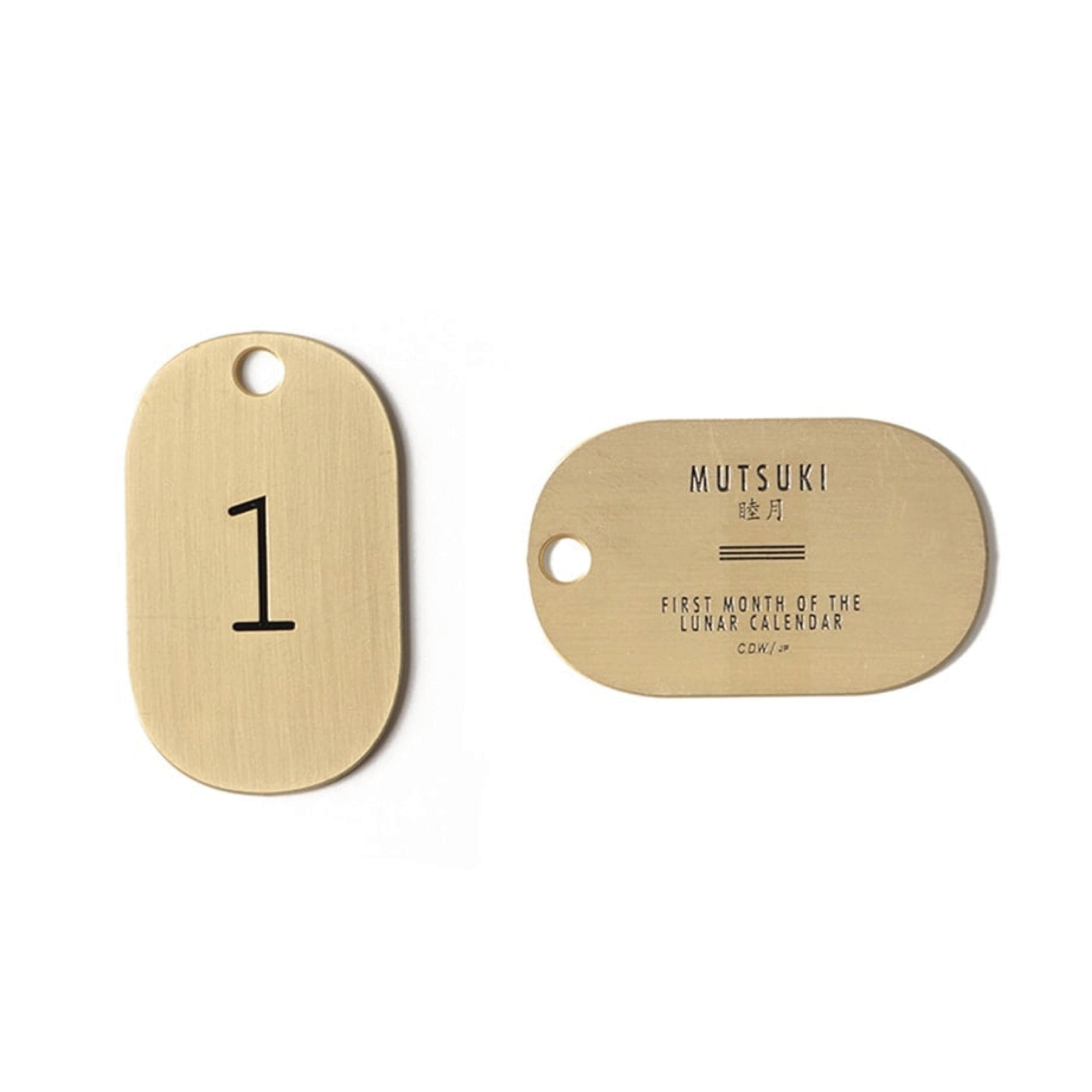 睦月、如月、弥生などの1月から12月までの太陽暦の月の呼び名を刻印した真鍮製のキータグ。