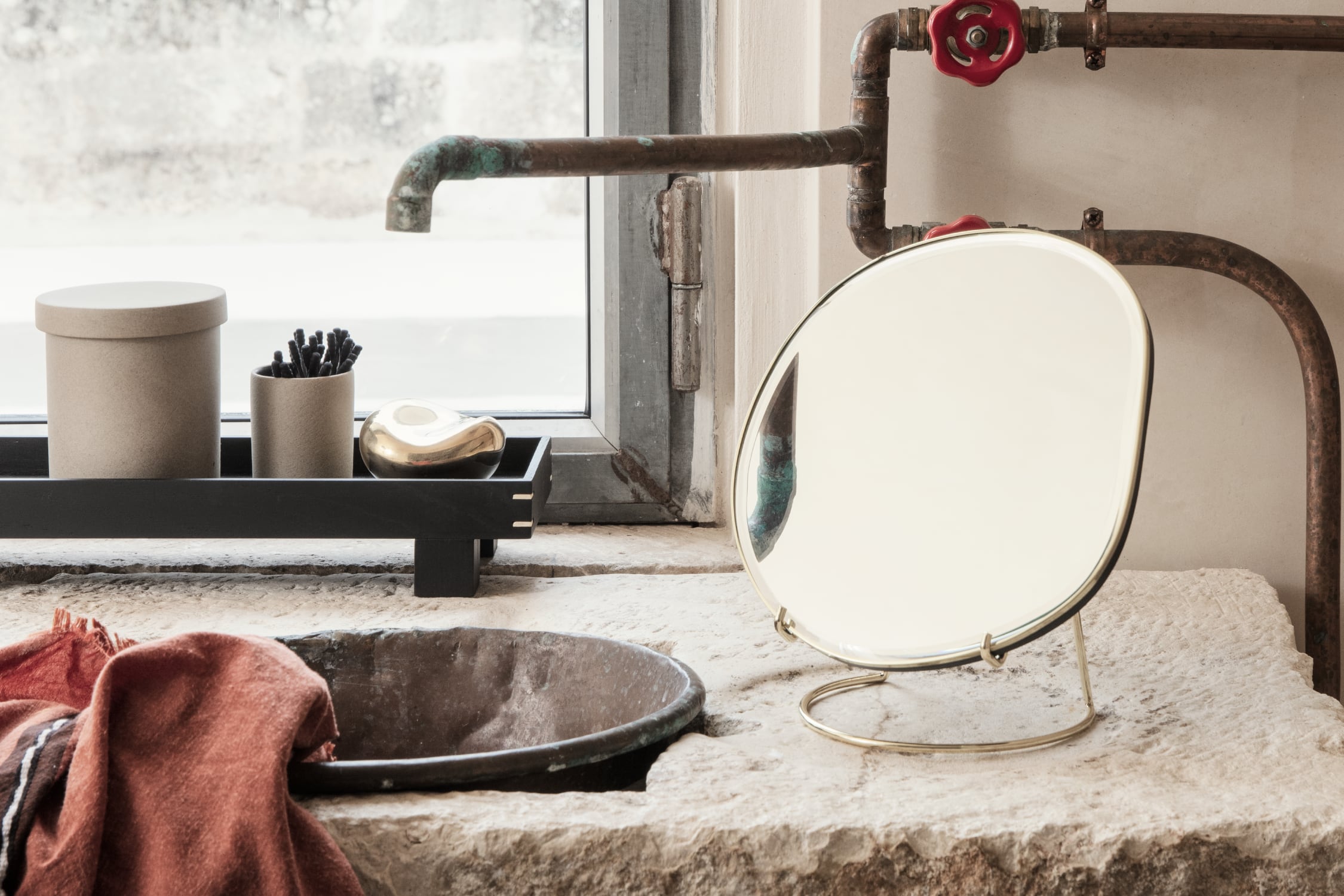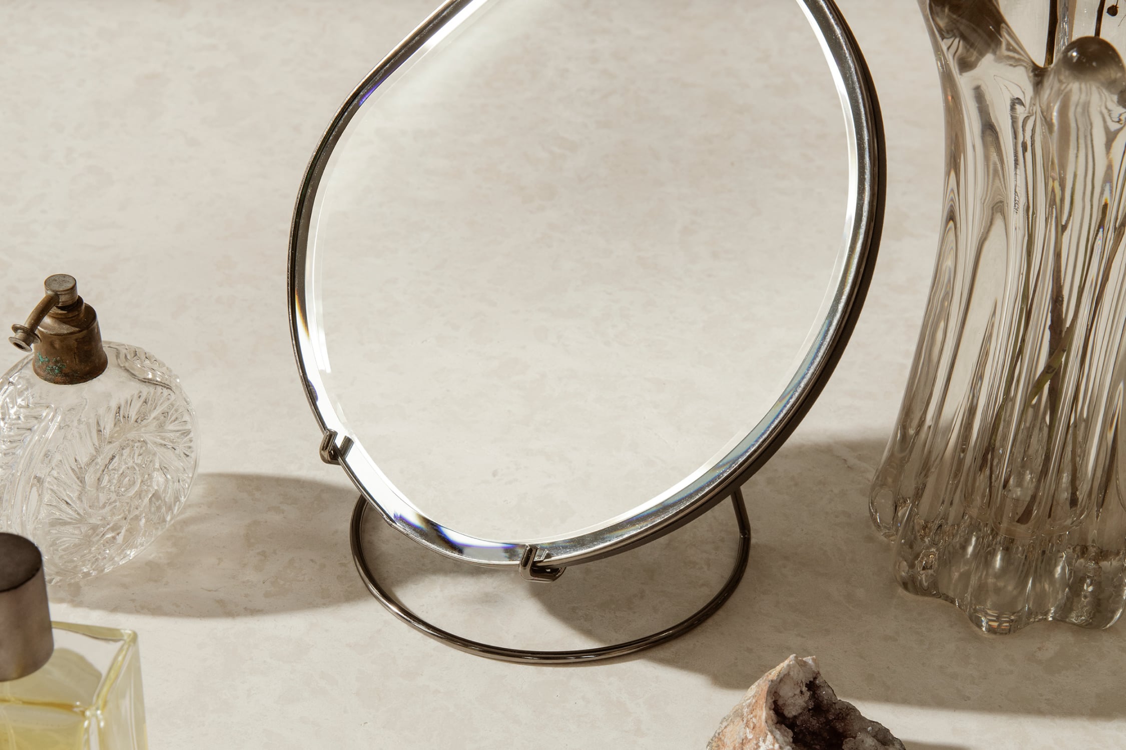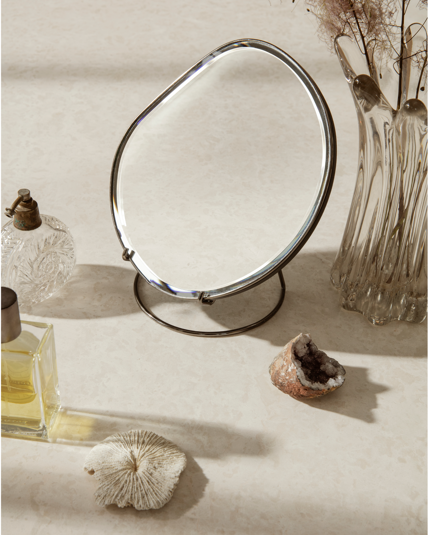 水面の揺らぎや自由な流れにインスピレーションを受けた、有機的でアシンメトリーな卓上ミラー。